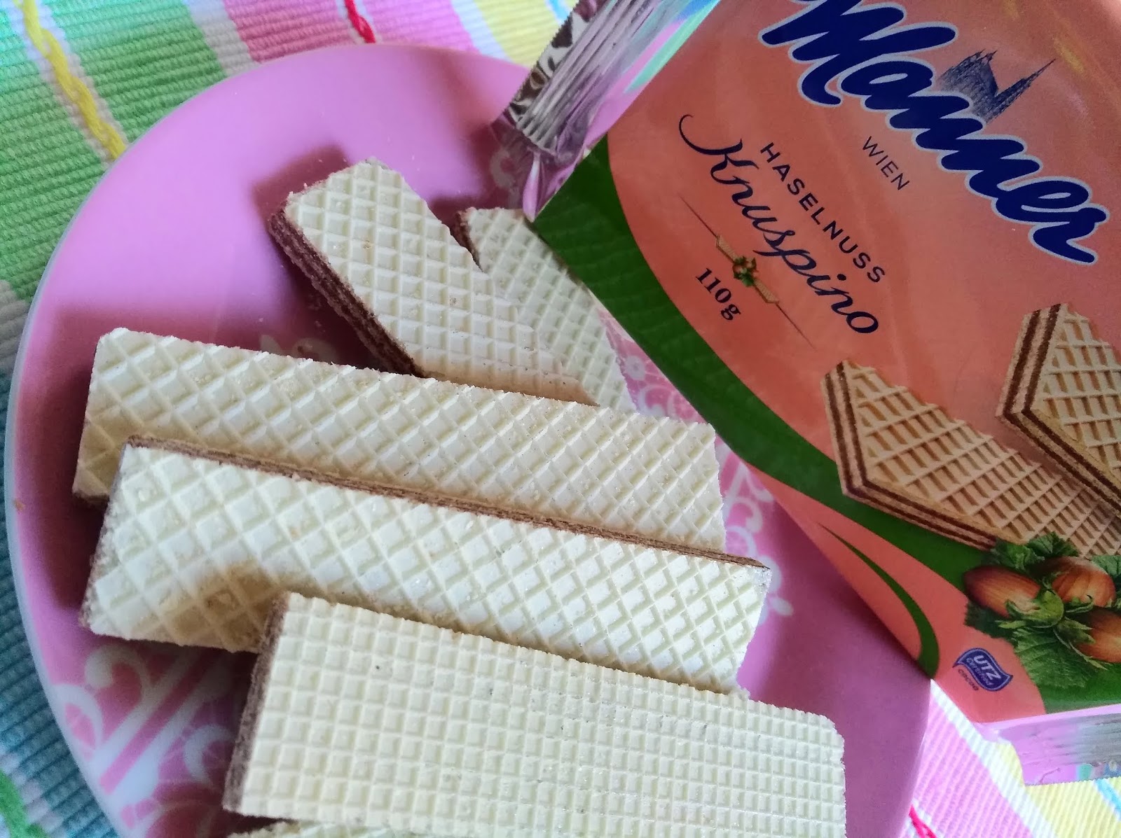 Knusprige Waffeln mit Haselnuss-, Schokoladen-, oder Vanillefüllung.